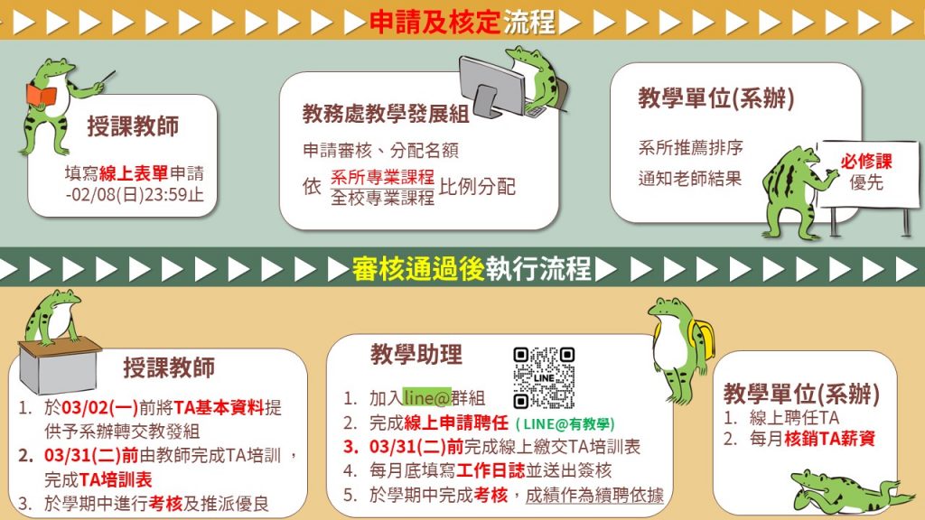 2.請於03/31(二)前完成TA培訓,由教師完成TA專業培訓於學期中進行考核及推派優良,逾期將影響授課教師下學期教學助理之申請。