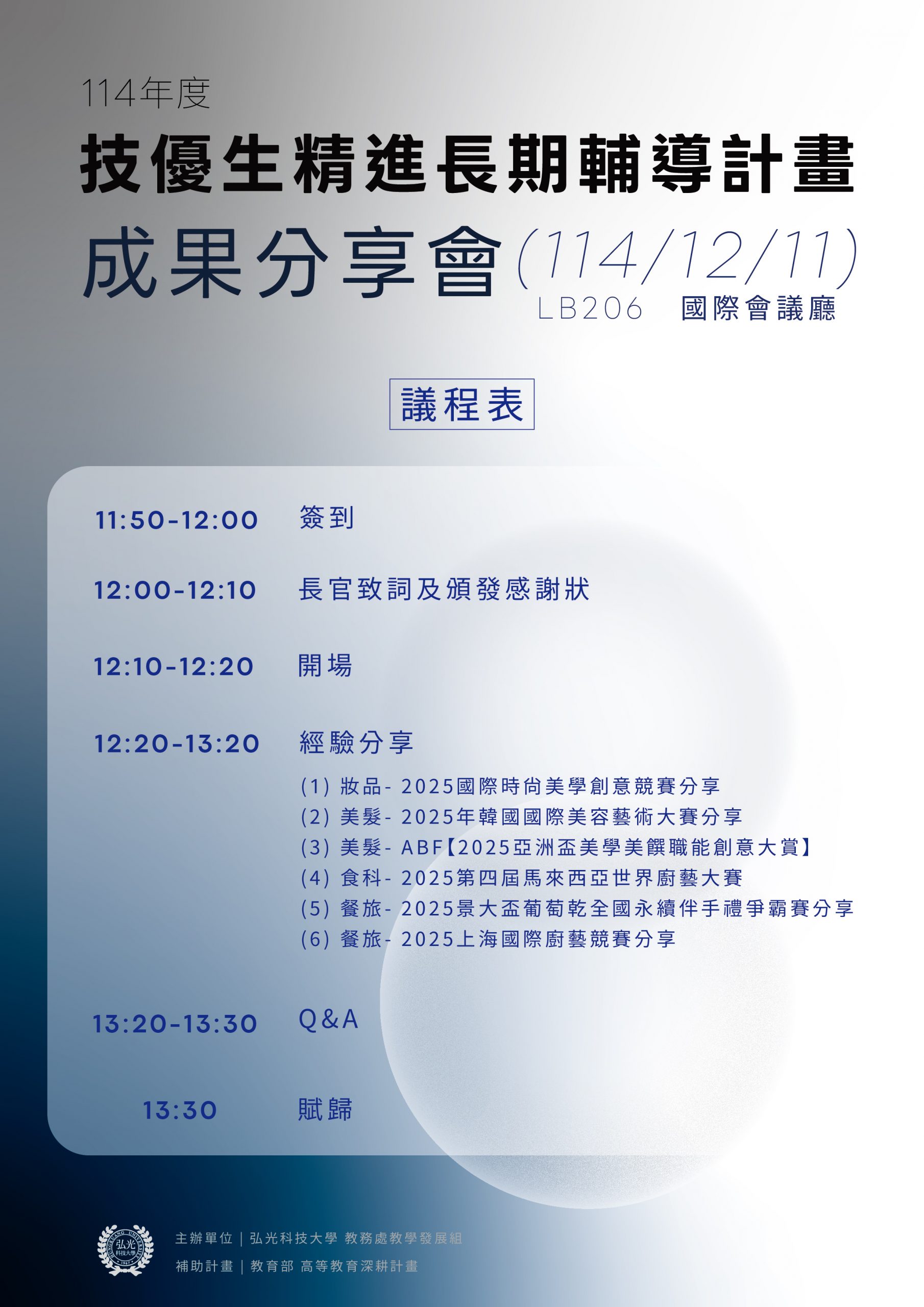 | 12:20 | 13:20 | 經驗分享 1. 妝品- 2025國際時尚美學創意競賽分享 2. 美髮- 2025年韓國國際美容藝術大賽分享 3. 美髮- ABF【2025亞洲盃美學美饌職能創意大賞】 4. 食科- 2025第四屆馬來西亞世界廚藝大賽 5. 餐旅- 2025景大盃葡萄乾全國永續伴手禮爭霸賽分享 6. 餐旅-2025第六屆上海國際廚藝競賽 |